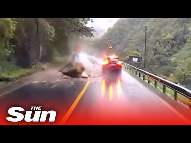 Título: Motorista de raciocínio rápido desvia de enorme pedra que cai em estrada na montanha