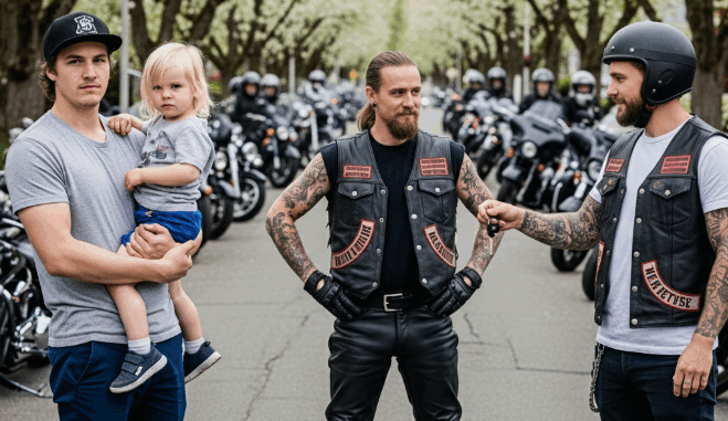 Do lado de fora da pequena casa alugada de Adam. Mais de 40 motocicletas enfileiradas na calçada como cavalos de aço. Cromados brilhavam sob o sol da manhã. Jaquetas exibiam insígnias desconhecidas para a maioria, mas instantaneamente reconhecíveis para aqueles que conheciam as ruas. Adam estava parado na porta, protegendo Lily atrás de si. Suas mãos tremiam levemente, não de medo, mas por não saber o que era aquilo.