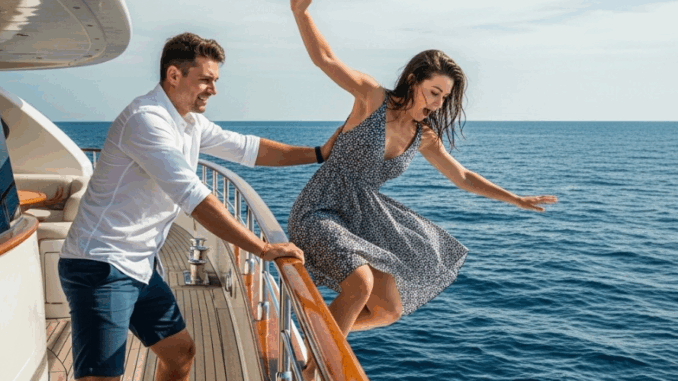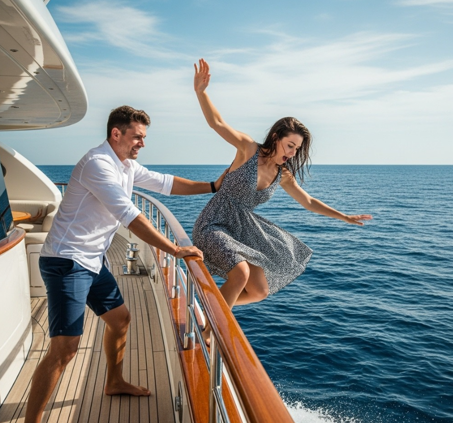 Olivier permaneceu imóvel, o olhar fixo no local onde ela desaparecera. O grito dela fora apenas um eco fugaz, abafado pelo rugido do mar e pelo abismo ao seu redor. Ele não jogou uma bola, não pediu socorro, não chorou. Pegou o celular, respirou fundo e discou um número. “Aqui é o Capitão Olivier”, disse com a voz trêmula. “Minha esposa.” Ele escorregou, caiu para o lado, deixou a voz falhar e caiu de joelhos, agarrando-se à borda do barco. Não houve lágrimas, apenas um silêncio contido, um ato calculado e o tique-taque suave de seu relógio de luxo.