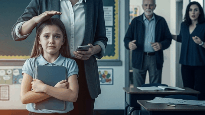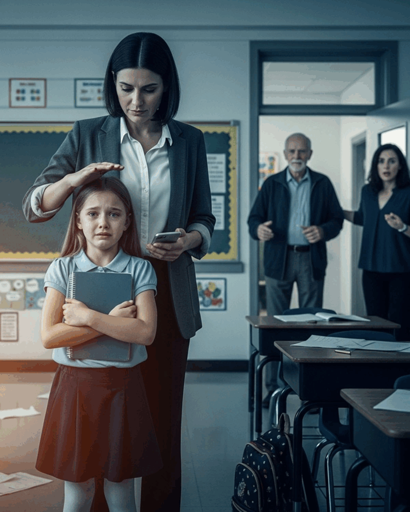 Dois policiais uniformizados entraram na sala de aula, avaliando rapidamente a cena. A menina estava escondida atrás da carteira, a professora a observava firmemente, a diretora pálida ao seu lado, e Rogelio, franzindo a testa. “Bom dia. Recebemos uma ligação sobre uma situação potencialmente perigosa com um aluno”, disse o policial em voz firme. Rogelio ergueu a cabeça e falou rapidamente, esperando dominar a cena. “Isso é um absurdo. Sou o avô da menina. Vim buscá-la como padrinho.”
