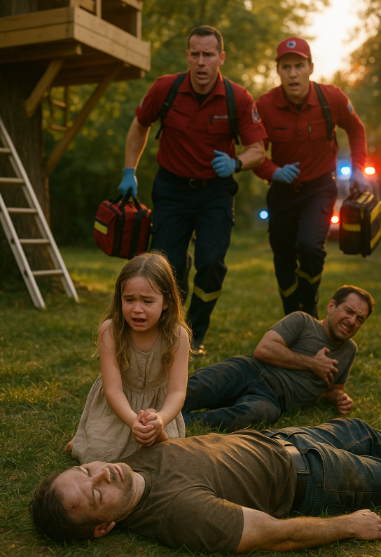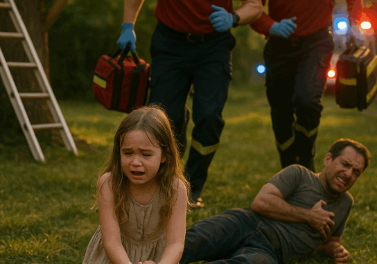 Eles caíram. Não estão se mexendo. Estávamos no quintal, e o papai disse que faríamos uma surpresa para a mamãe quando ela chegasse em casa. Ele subiu com o Sr. Parker para consertar a corda da casa na árvore. Aí a escada escorregou. Eles caíram. Por favor… eles não estão acordando.