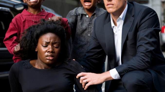 Na calçada, uma jovem cambaleou para a frente, agarrando uma sacola de lona rasgada contra o peito como se fosse sua última âncora. Seu nome era  Maya Thompson , 32 anos, moradora de rua, lutando com todas as forças para continuar — pelo bem de seus gêmeos de dois anos,  Eli e Grace , que se agarravam às suas mãos.