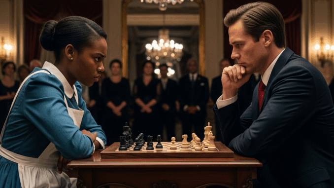 O jogo havia começado. Richard estalou os dedos, fingindo calma. “Boa jogada para alguém que limpa banheiros”, disse ele, tentando se recompor, mas a tensão no ar havia mudado. Os convidados, que antes zombavam, agora observavam atentamente. Elena ajustou seu uniforme simples, respirou fundo e tocou a próxima peça. Ela a moveu com firmeza, sem hesitação. A sala ficou em silêncio. Cada um de seus movimentos parecia friamente calculado. Richard fez um movimento agressivo, avançando sua rainha.