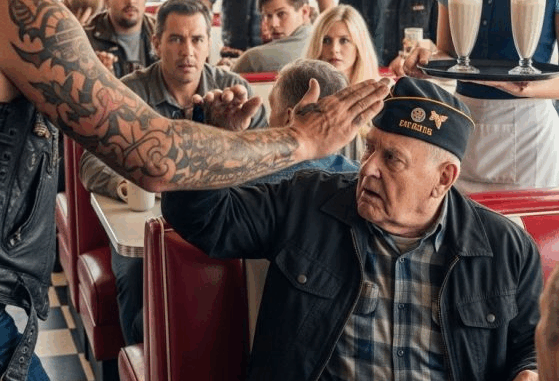 A paz se rompeu repentinamente quando a porta se abriu com estrondo e uma rajada de vento frio soprou para dentro. Todas as cabeças se viraram. Cole Tanner, um motociclista de ombros largos, vestido com couro grosso, com correntes tilintando enquanto caminhava, entrou pela porta. Suas botas batiam no chão com força deliberada, ecoando pelo pequeno espaço. Os olhos do homem percorreram a sala até se fixarem em Harold. Algo na presença calma do veterano pareceu provocá-lo. Com um sorriso de escárnio repuxando os lábios, ele se dirigiu diretamente para a mesa do canto.