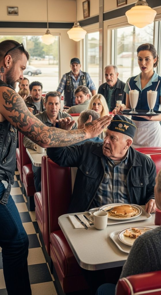 A resposta, dita com uma compostura inabalável, só alimentou a arrogância do motociclista. Sem aviso, a mão de Cole voou sobre a mesa, atingindo Harold com força na bochecha. O som do tapa ecoou pelo restaurante. O boné de Harold caiu no chão e seu café se espalhou pela mesa. Uma garçonete ofegou e levou a mão à boca, uma mãe protegeu os olhos do filho e a família na mesa ficou em silêncio. Cole riu, orgulhoso de sua demonstração. “Deveria ter ficado no passado, soldado”, zombou.
