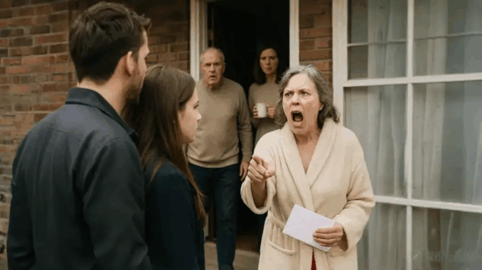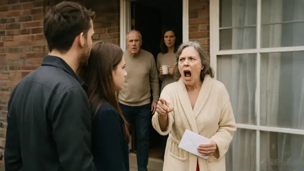 Ela estava parada na minha varanda, com aquele mesmo roupão felpudo, segurando a carta de despejo, agora amassada e úmida, como se a tivesse apertado por duas horas seguidas. Abri a porta, mas não a convidei a entrar.