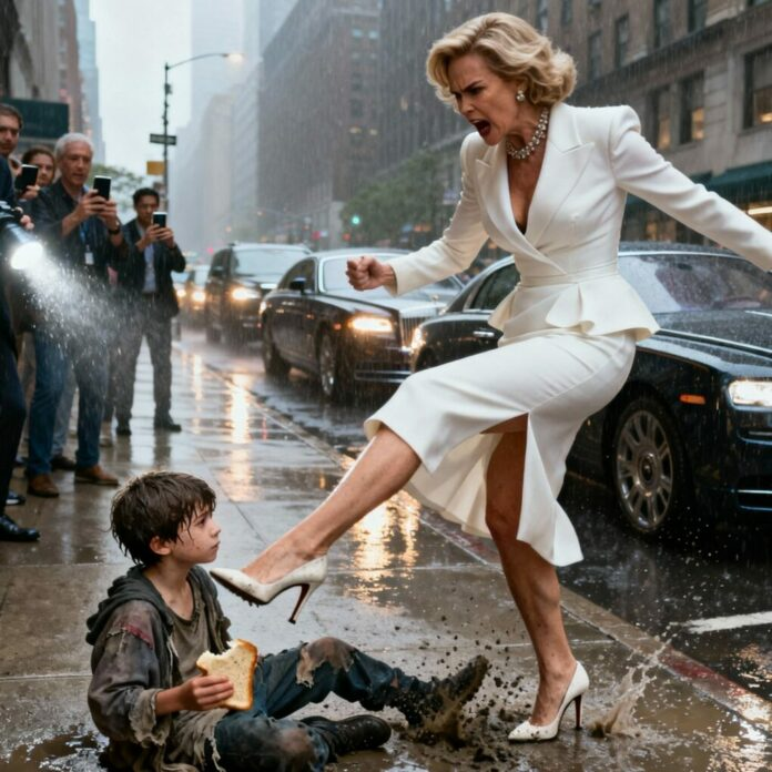 Murmúrios de choque percorreram a multidão. As câmeras dispararam. Isabella Reed — ícone da moda, filantropa — flagrada em vídeo empurrando uma criança sem-teto.