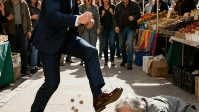 Ao passar, a mulher estendeu a mão acidentalmente em direção à perna dele, talvez o confundindo com alguém que oferecesse ajuda. O orgulho de Daniel se inflamou. Sem pensar, ele afastou a perna bruscamente e chutou a mão dela para o lado , murmurando: “Não me toque”. O movimento foi mais brusco do que ele pretendia, e a mulher caiu para trás, derramando moedas do seu copo no asfalto.