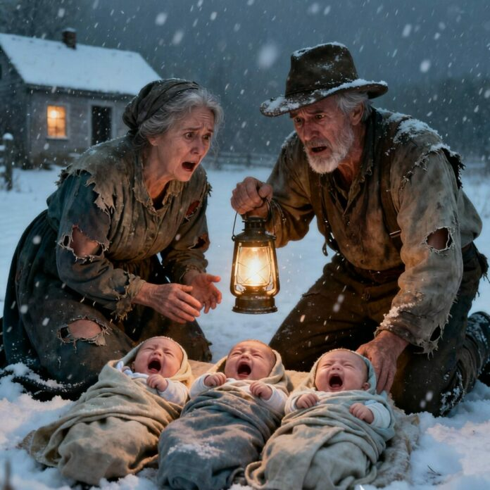 Mark pegou o casaco e a lanterna, saindo para a tempestade congelante. A luz atravessou a neve em feixes trêmulos até iluminar uma pequena cesta de vime ao lado do portão. Ellen correu atrás dele, com o coração disparado. Dentro da cesta estavam três recém-nascidos , enrolados em cobertores finos já úmidos de neve. Seus rostinhos estavam vermelhos e trêmulos.