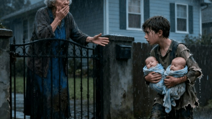 Ela apertou os olhos. Era um menino, talvez de dez ou onze anos, encharcado até os ossos. Quando ele chegou ao portão, seus joelhos cederam e ele caiu, abraçando com força dois pequenos embrulhos .