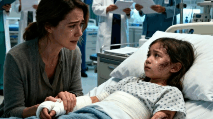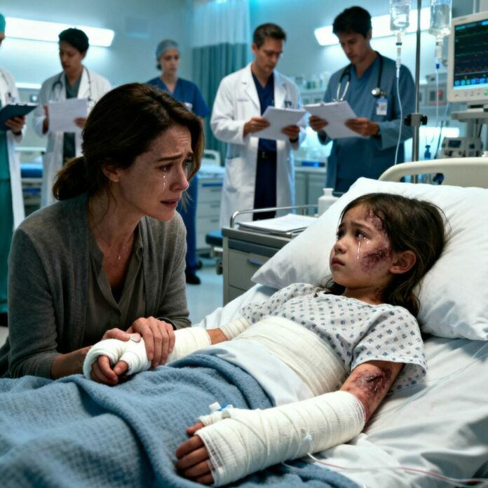 Quando cheguei ao hospital, o mundo parecia abafado, como se estivesse abafado pelo pânico. No quarto 417, minha filha de oito anos jazia envolta em várias camadas de ataduras brancas, seu pequeno corpo cercado por fios e máquinas. Suas bochechas estavam manchadas de lágrimas secas.