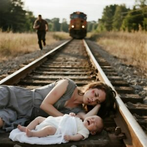 Uma jovem estava amarrada aos trilhos , os pulsos presos com uma corda grossa e os tornozelos acorrentados ao corrimão de aço. Seu vestido rasgado colava-se à pele machucada, e seus longos cabelos castanhos estavam emaranhados de sujeira e suor. Mas o que revirou o estômago de Noah foi o pequeno bebê que ela apertava contra o peito, envolto em um cobertor esfarrapado, chorando fracamente.
