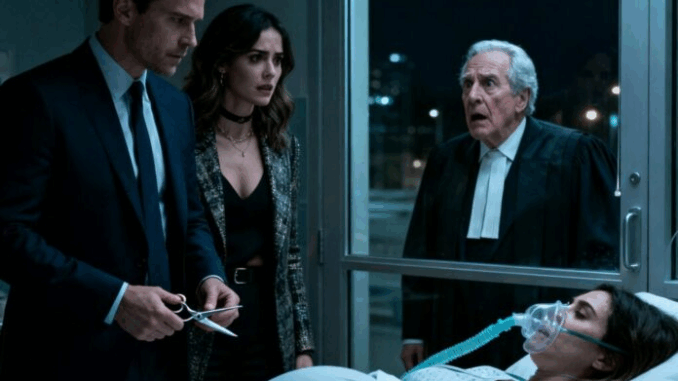 Agora, sob a luz tênue da UTI, Edward aproximou-se da cama. O suave chiado do concentrador de oxigênio preenchia o silêncio. Ele enfiou a mão no bolso e tirou uma tesoura cirúrgica. Sua mão tremia, não de culpa, mas de medo de ser descoberto. “Você finalmente descansará em paz”, sussurrou. Com um movimento rápido, cortou o tubo de oxigênio. O monitor disparou alarmes e luzes vermelhas piscaram por todo o quarto. O corpo de Isabella se contraiu enquanto ela lutava para respirar. Edward congelou. Não esperava que fosse tão alto.