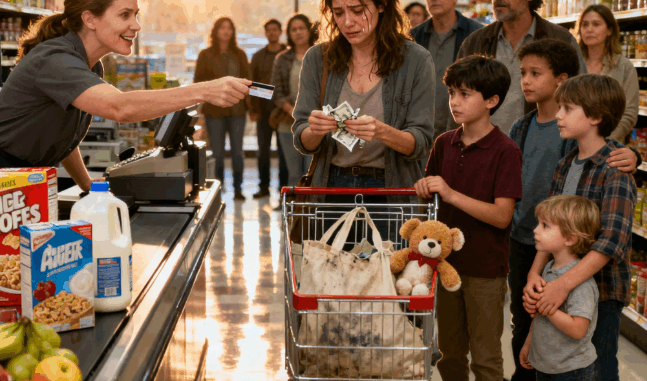 Mãe de quíntuplos não consegue pagar as compras do supermercado; voz ao fundo diz: ‘Sua conta já está paga’