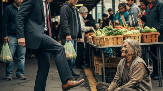 Uma mulher com roupas esfarrapadas estava encolhida encostada em um poste de luz. Seus cabelos estavam grisalhos, seu casaco fino e desfiado, sua mão trêmula enquanto estendia a mão.