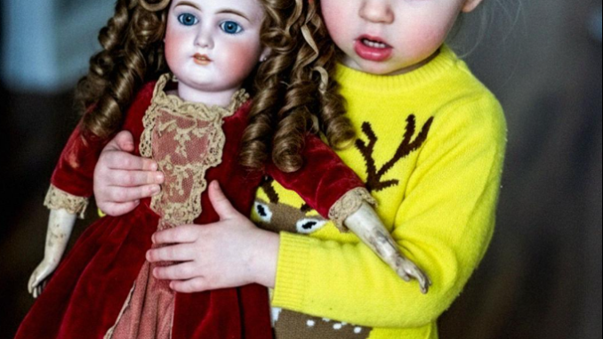 Ela tinha olhos azuis brilhantes, bem abertos. E segurava uma boneca menor em seus braços de pano.