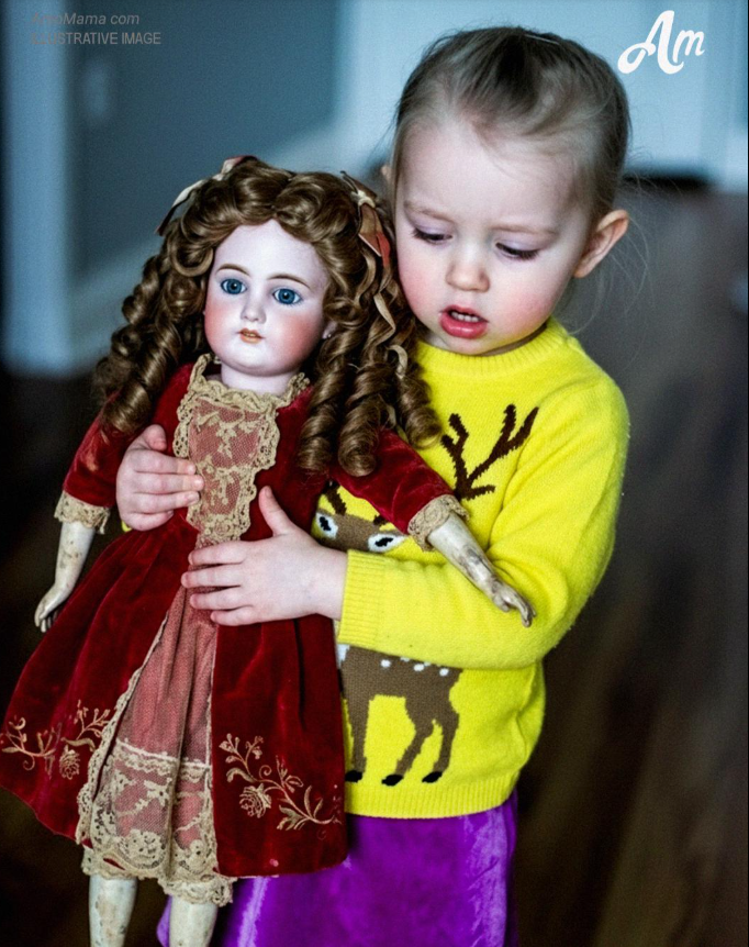 “Ela é linda!”, exclamou Eva, abraçando a boneca com força. “Ela até tem um bebê! Mamãe, olha!”