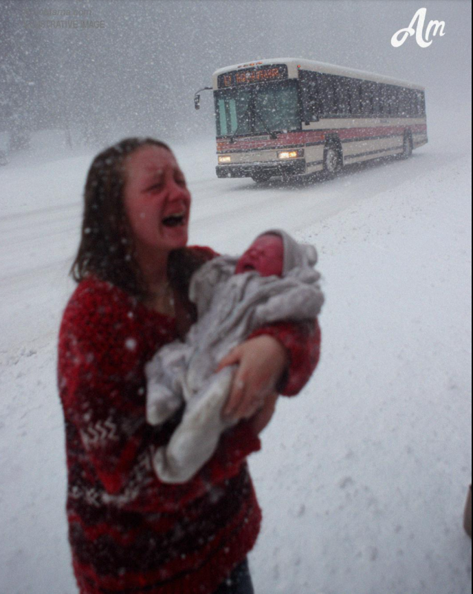 Lá dentro, o motorista estava de pé, imponente, sobre uma jovem mulher que segurava um bebê pequeno enrolado em uma jaqueta grande demais.