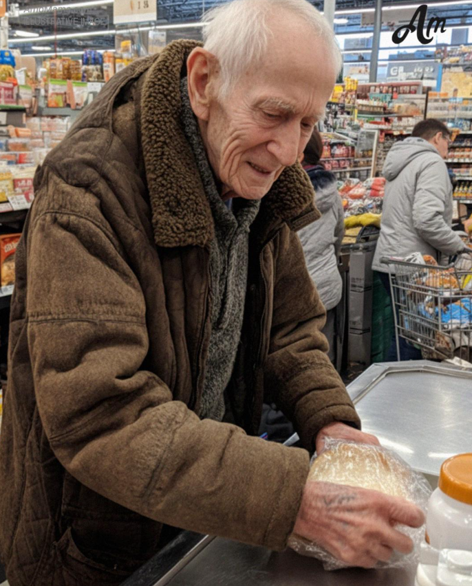 Ele parecia pequeno e estava ligeiramente curvado, vestindo uma jaqueta desbotada que já vira décadas melhores. Suas mãos tremiam enquanto colocava um pão, um pote de manteiga de amendoim e uma caixinha de leite no cinto — itens tão básicos que chegavam a doer só de olhar.